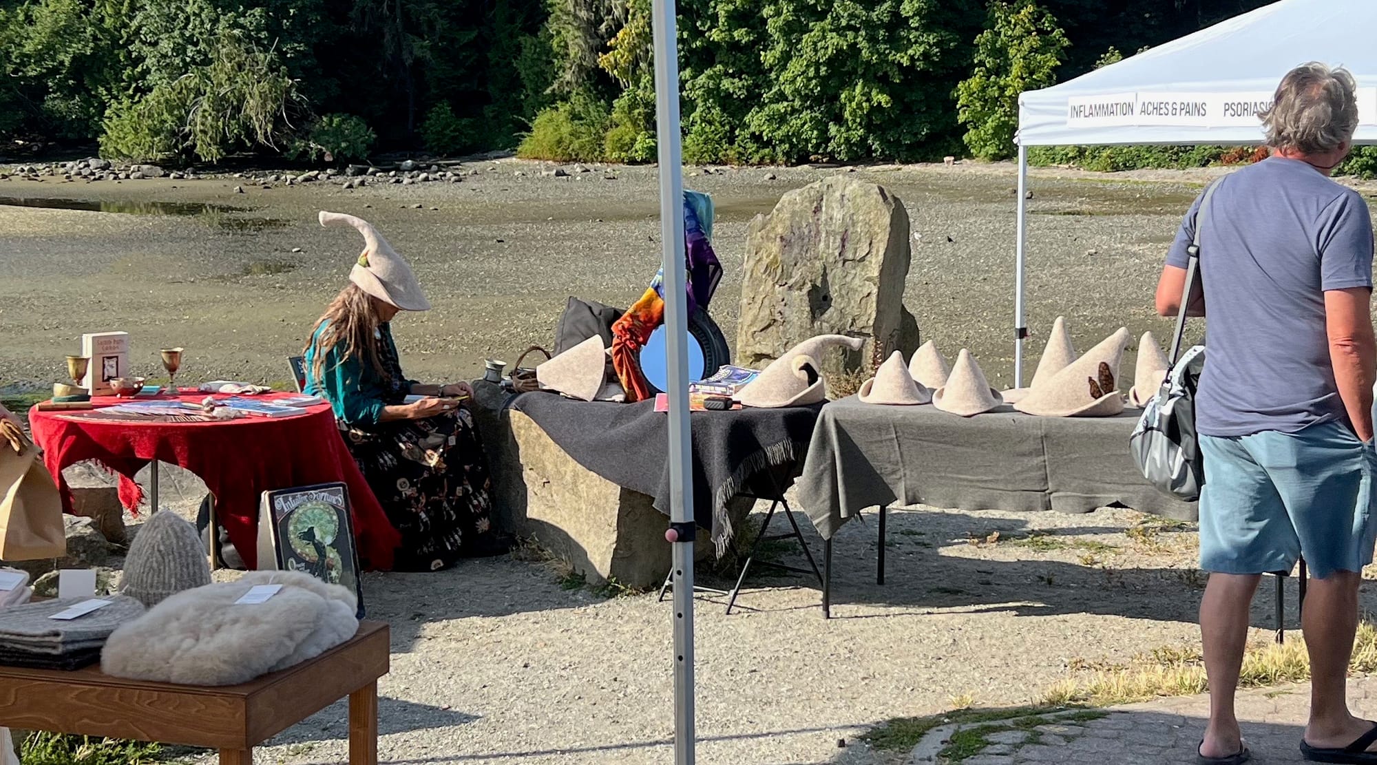 The Essential Salt Spring Island We got to Salt Spring Island for the first time ever, and it is easy to understand why it is so popular: a vibrant arts scene, beautiful surroundings, friendly people. It seems like almost everyone sells something - goat milk, goat cheese, farm produce, soap, wine, pottery, glass, art, mixed media, everything you can imagine from those straddling the line between a hobby and a living. Boaters, hikers, cyclists and kayakers are here too. In our 6 days we went to a live music concert, enjoyed live music in a restaurant we walked to, took in two different markets (one mostly food and the other mostly arts and crafts) and only scratched the surface of the galleries, bakeries, bookstores and restaurants. The only national brands in view were CIBC and BMO, but it seemed like every rural driveway had a stall selling ... something.